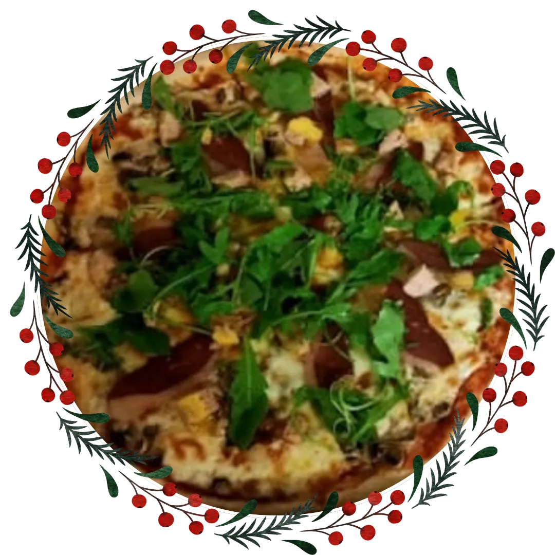 Tomate, fromage,pepperonni, merguez, poulet, boeuf haché, pommes de terres, sauce barbecue