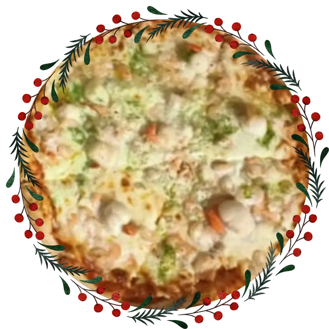 Tomate, fromage, poulet, champignons, persillade, mozzarella, crème